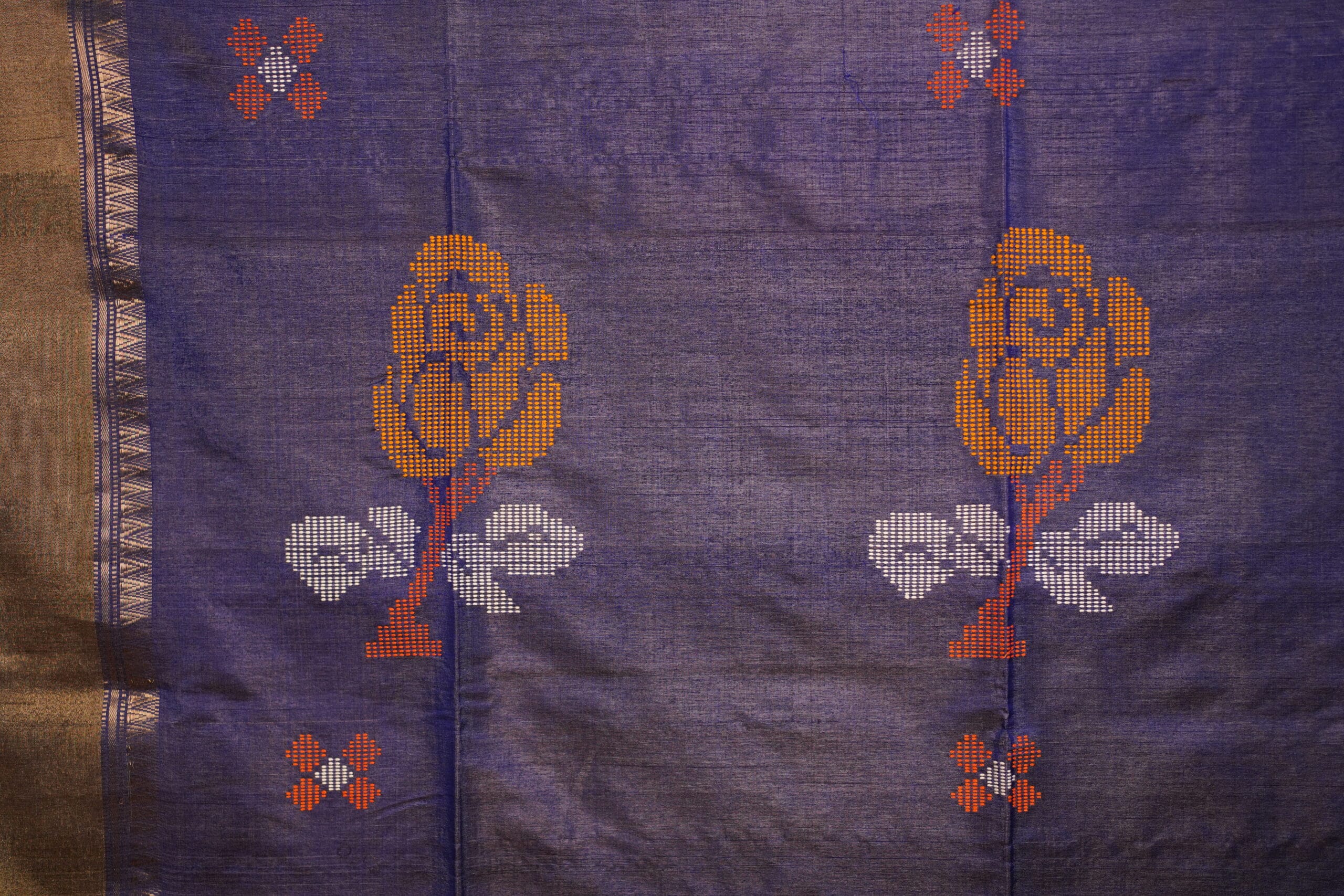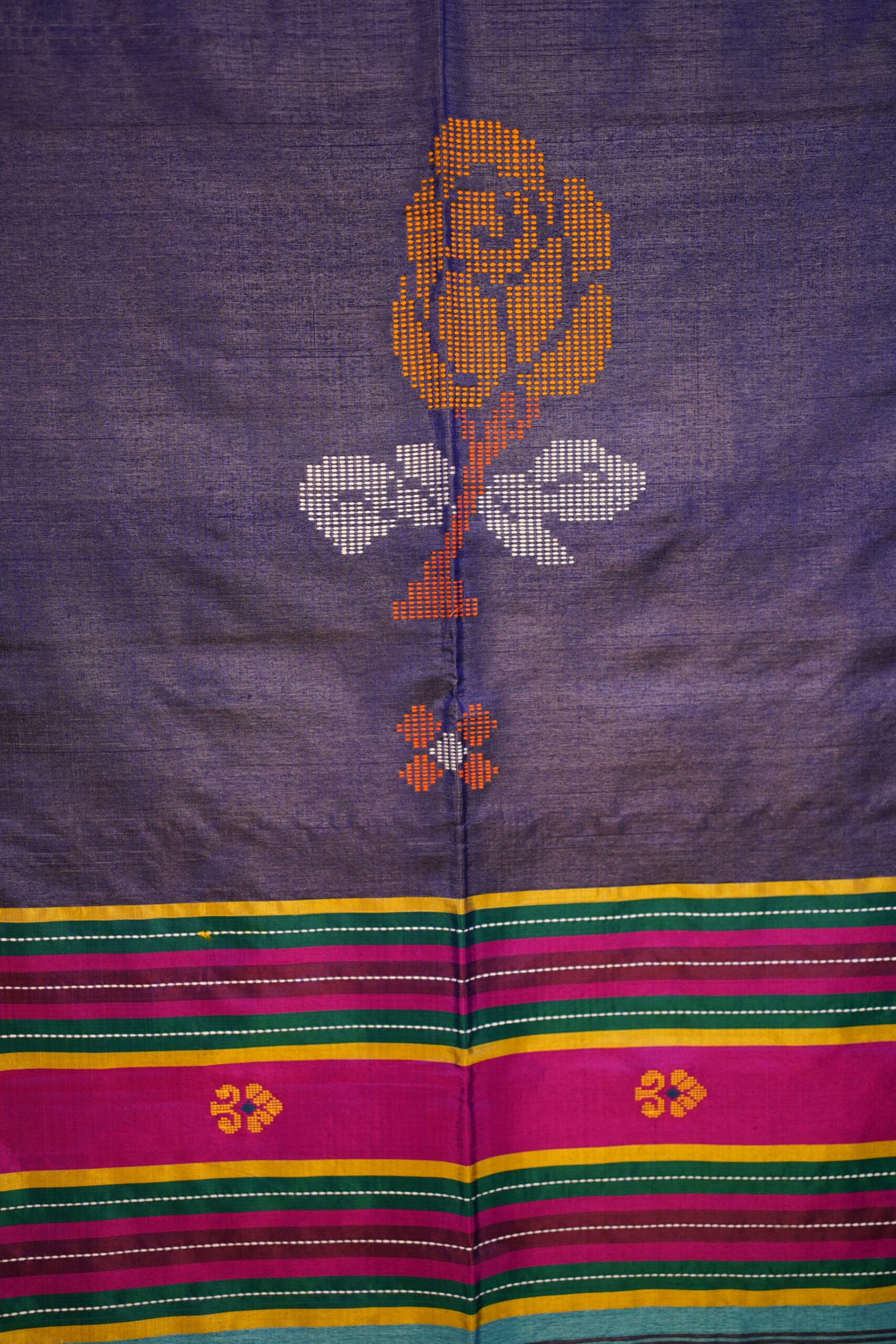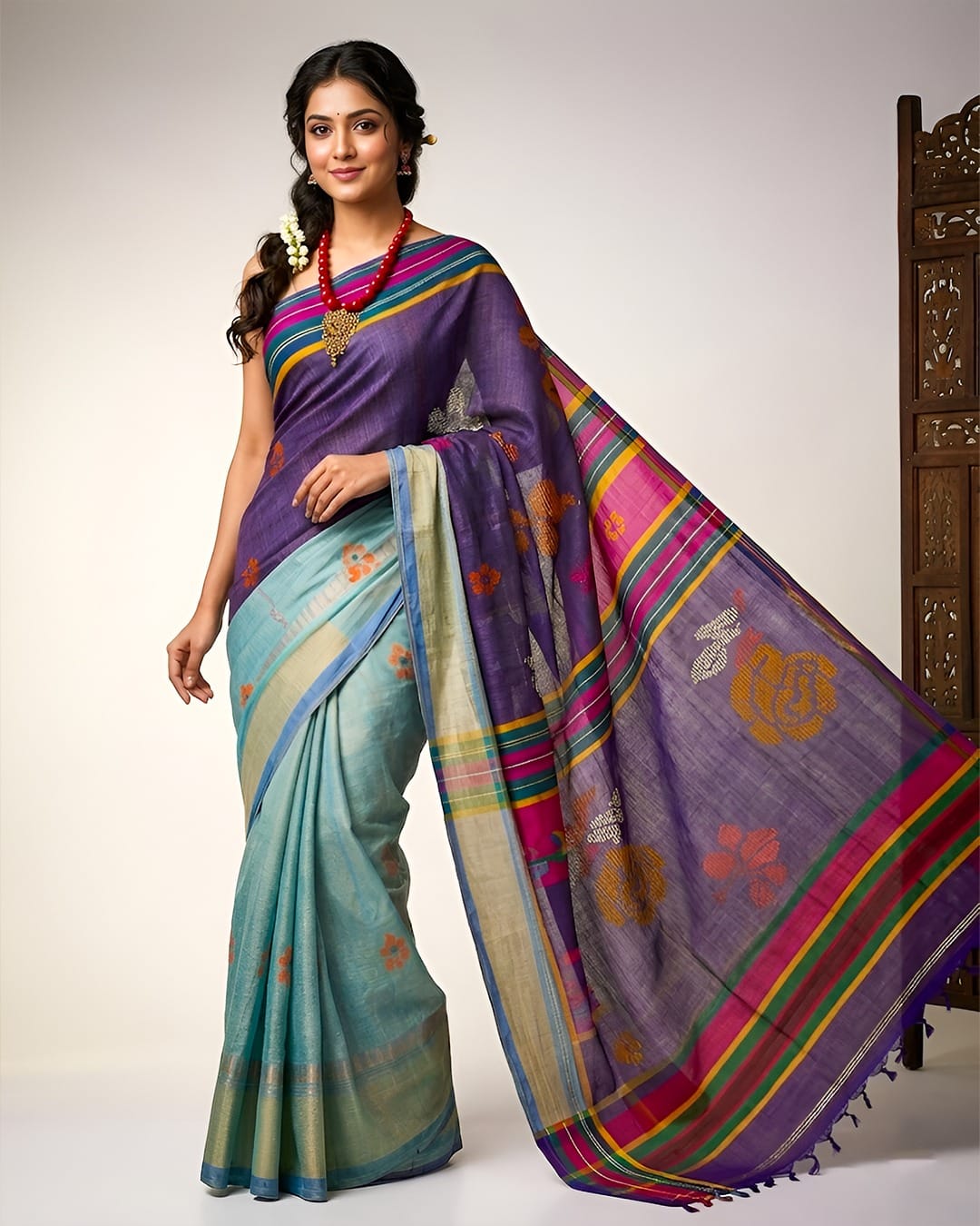 Work: Authentic Baavan Buti weave, featuring intricately crafted floral motifs arranged across the body. The saree celebrates Bihar’s heritage weaving technique with its distinctive dotted motif structure and elegant handcrafted finish.