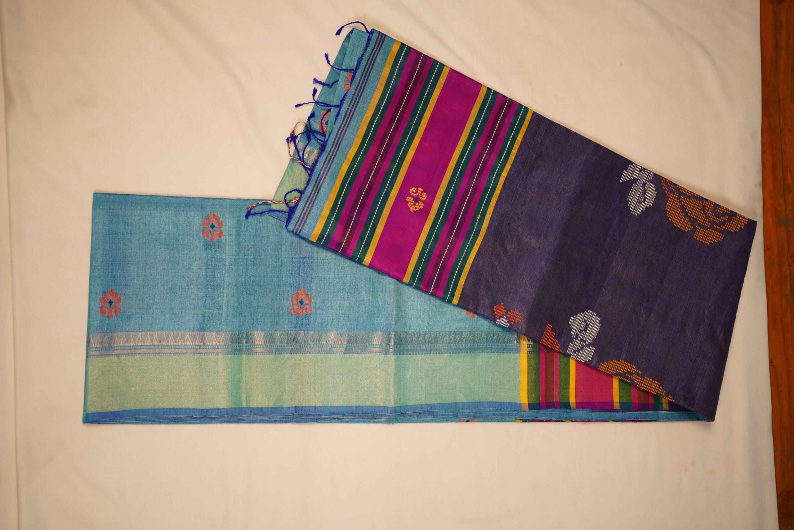 Border: Traditional zari border with vibrant multicolor stripe detailing on the pallu