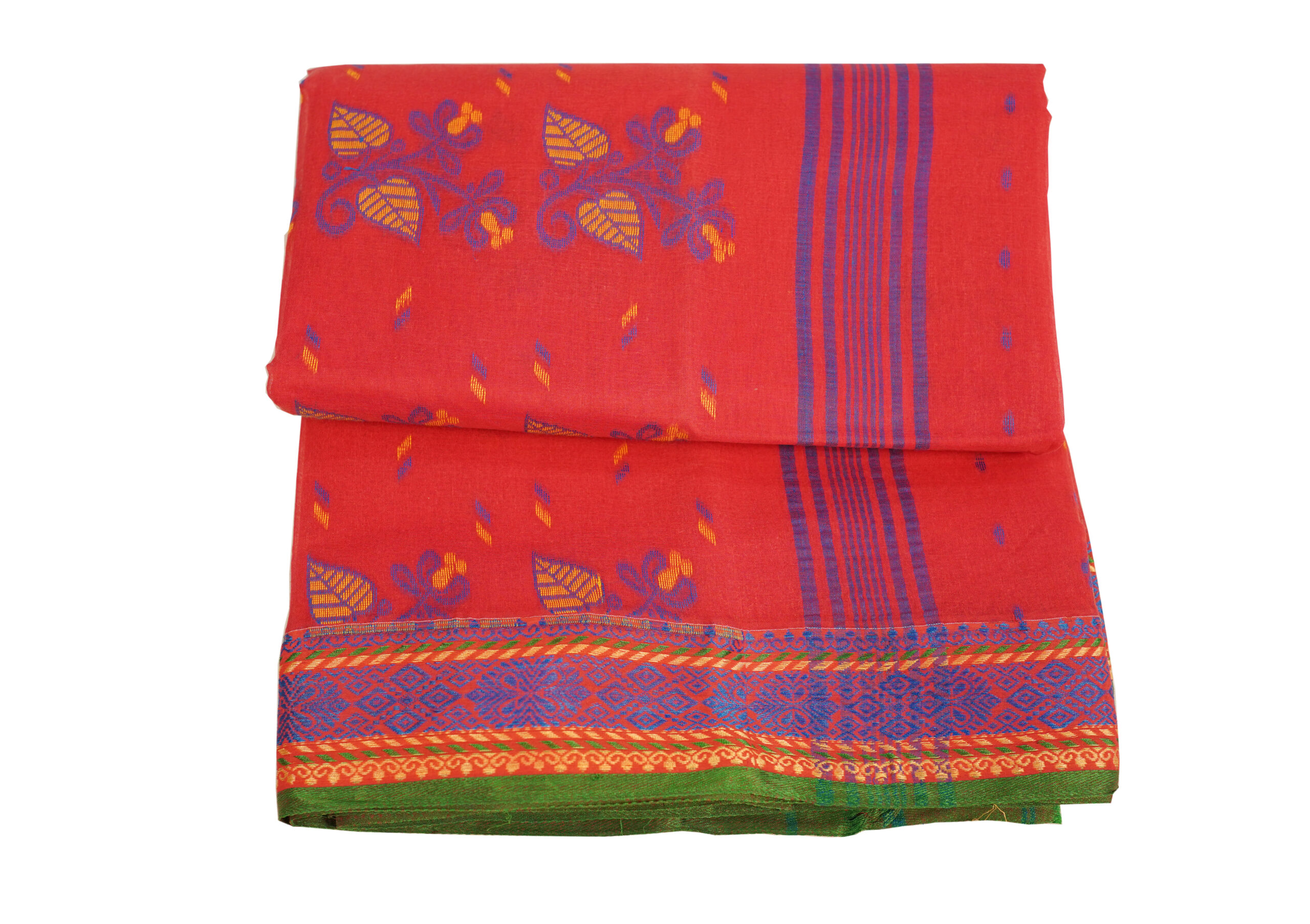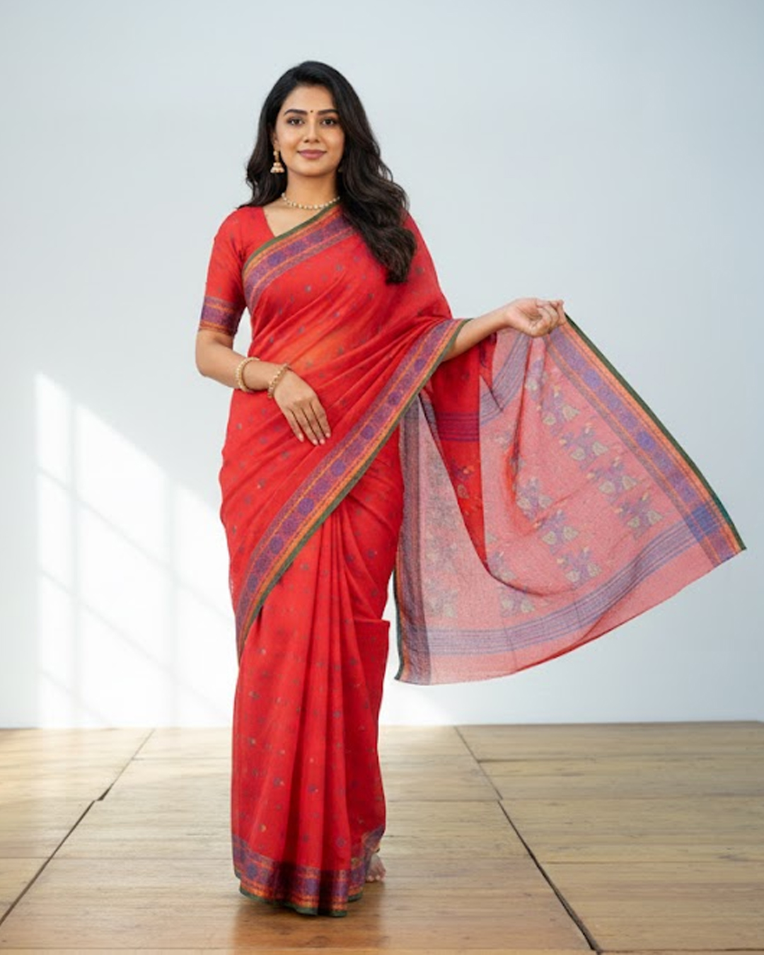 Work: Subtle woven buttis across the body with a lightweight, softly textured pallu showcasing classic Bengal weave aesthetics