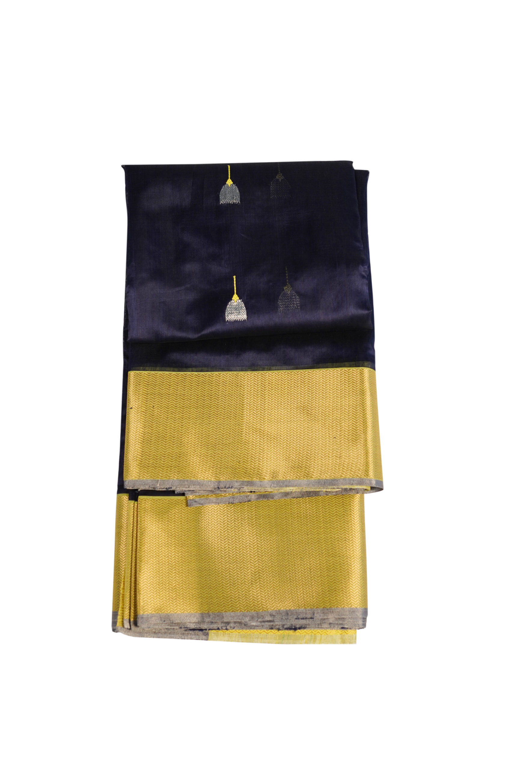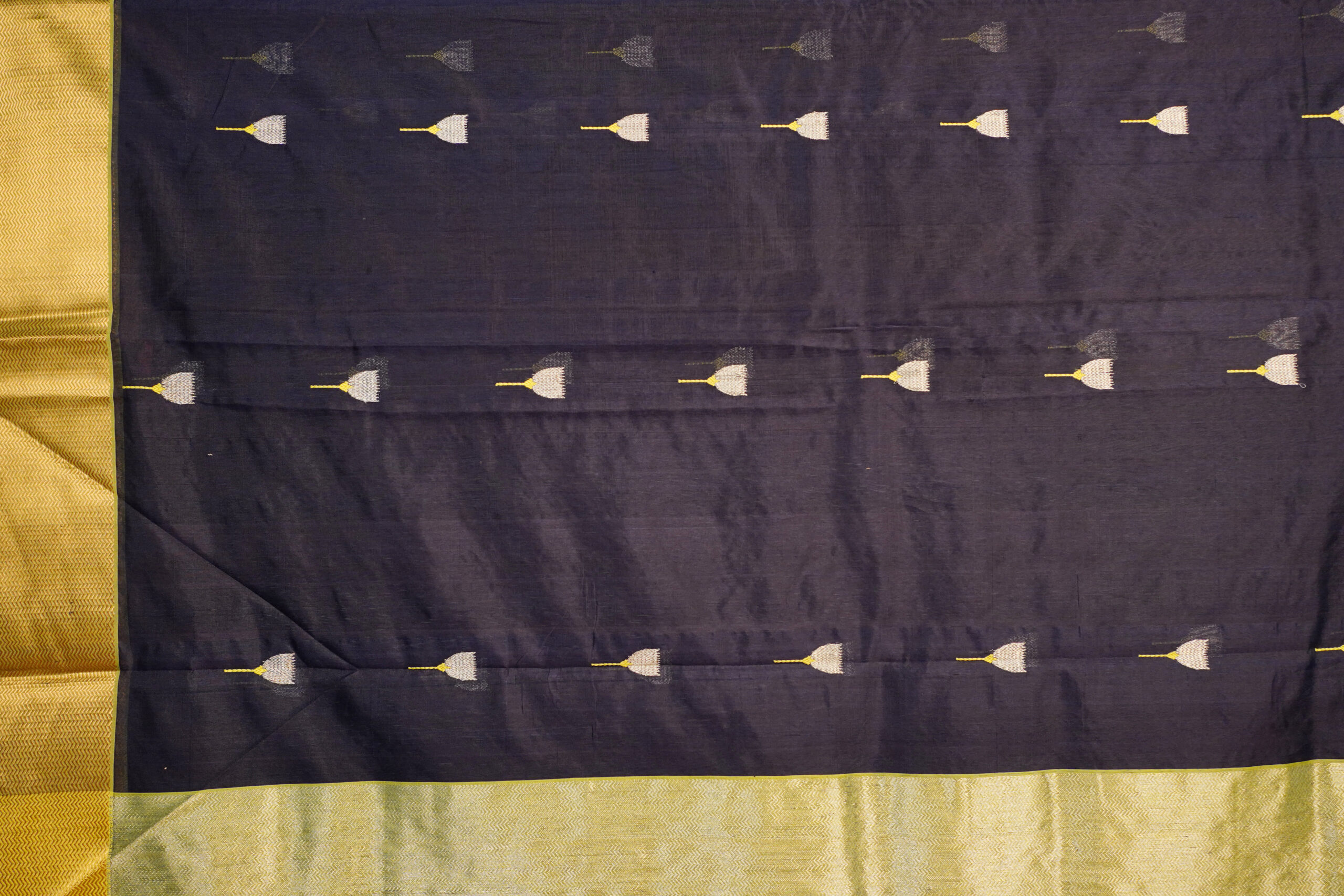 Border: Broad mustard yellow woven border with a subtle silk sheen