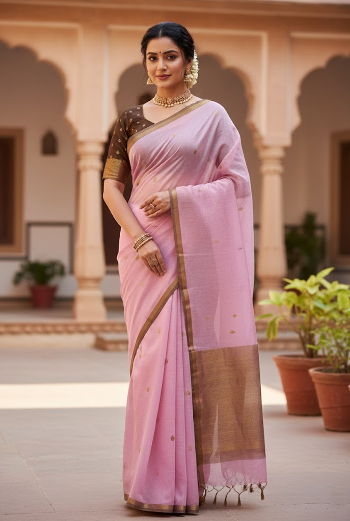Border: Subtle gold border with brown pallu detailing